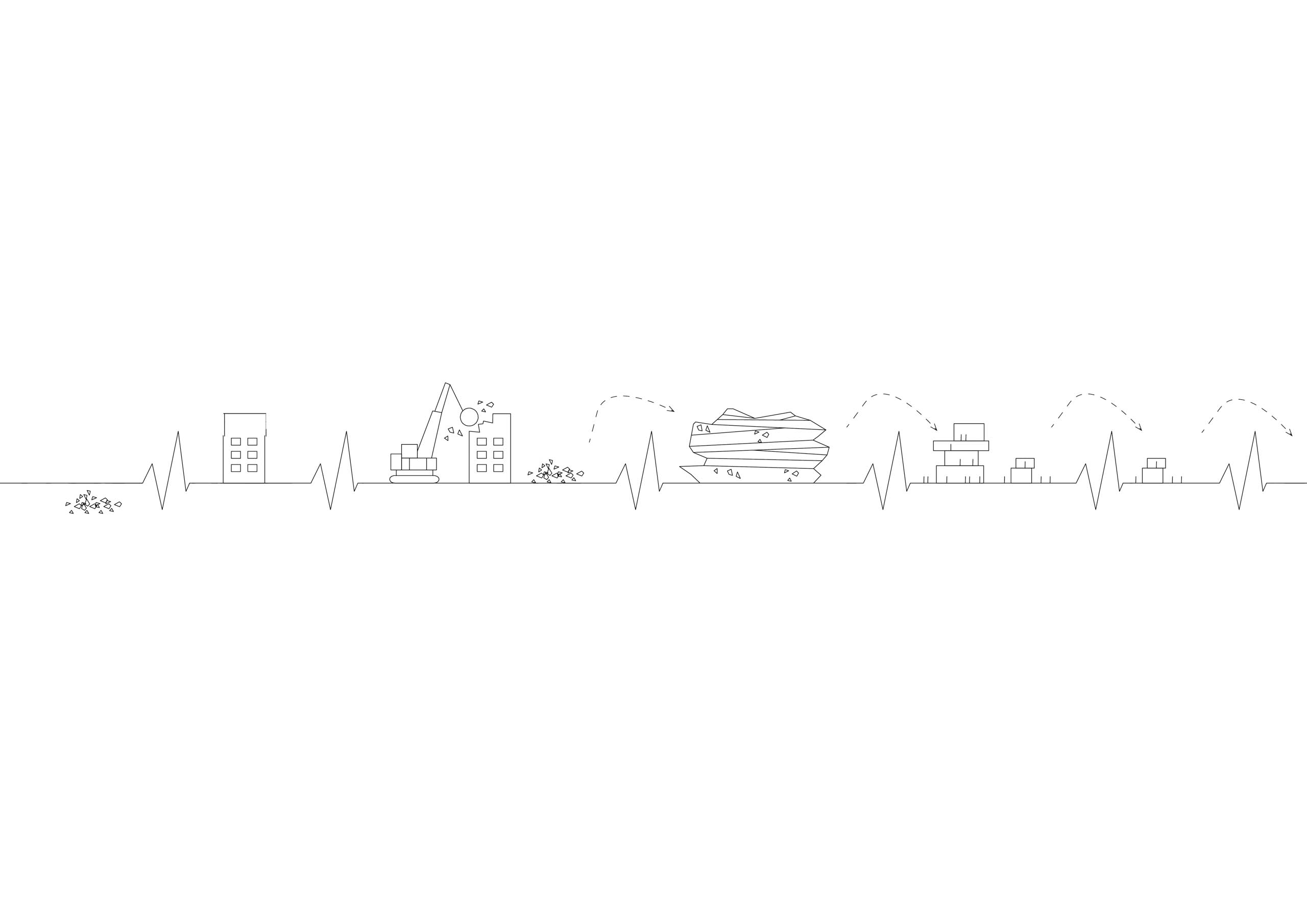 Thinking about the future, thinking about the future society, we designed a pavilion that was to carry a message, and that was to contribute as little as possible to environmental devastation. In cooperation with local organizations, forgoing intercontinental transportation, our pavilion was to be built from recycled materials. Selective demolition of buildings, warehouses and landfills, would provide the building blocks for the formation of the building’s body.